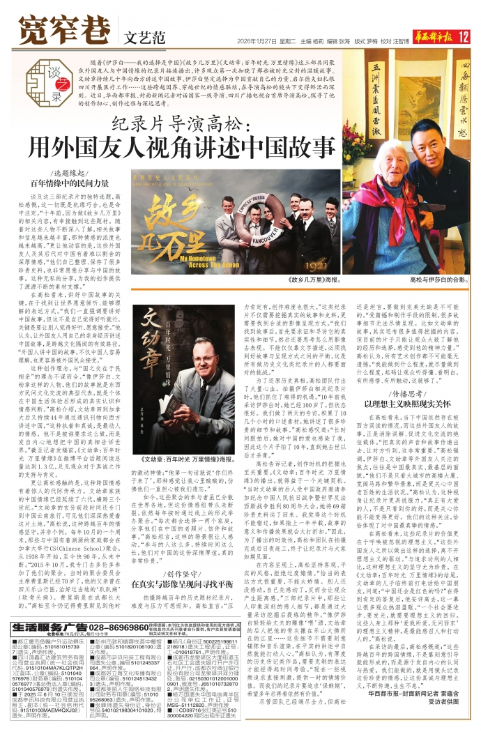 随着《伊莎白——我的选择是中国》《故乡几万里》《文幼章:百年时光万里情缘》这三部共同聚焦外国友人与中国情缘的纪录片接连播出,许多观众第一次知晓了那些被时光尘封的温暖故事。文幼章持续几十年向西方讲述中国故事、伊莎白坚定选择为中国贡献自己的力量、启尔德夫妇扎根四川开展医疗工作……这些跨越国界、穿越世纪的情感联结,在导演高松的镜头下变得鲜活而深刻。近日,华西都市报、封面新闻记者对话国家一级导演、四川广播电视台首席导演高松,探寻了他的创作初心、制作过程与深远思考。