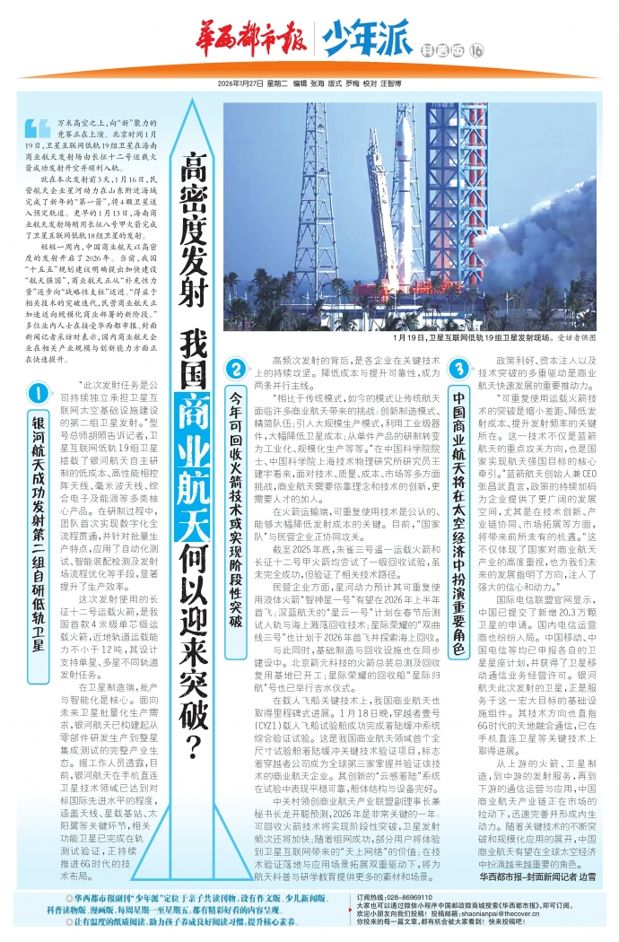 从上游的火箭、卫星制造,到中游的发射服务,再到下游的通信运营与应用,中国商业航天产业链正在市场的拉动下,迅速完善并形成内生动力。随着关键技术的不断突破和规模化应用的展开,中国商业航天有望在全球太空经济中扮演越来越重要的角色。华西都市报-封面新闻记者边雪