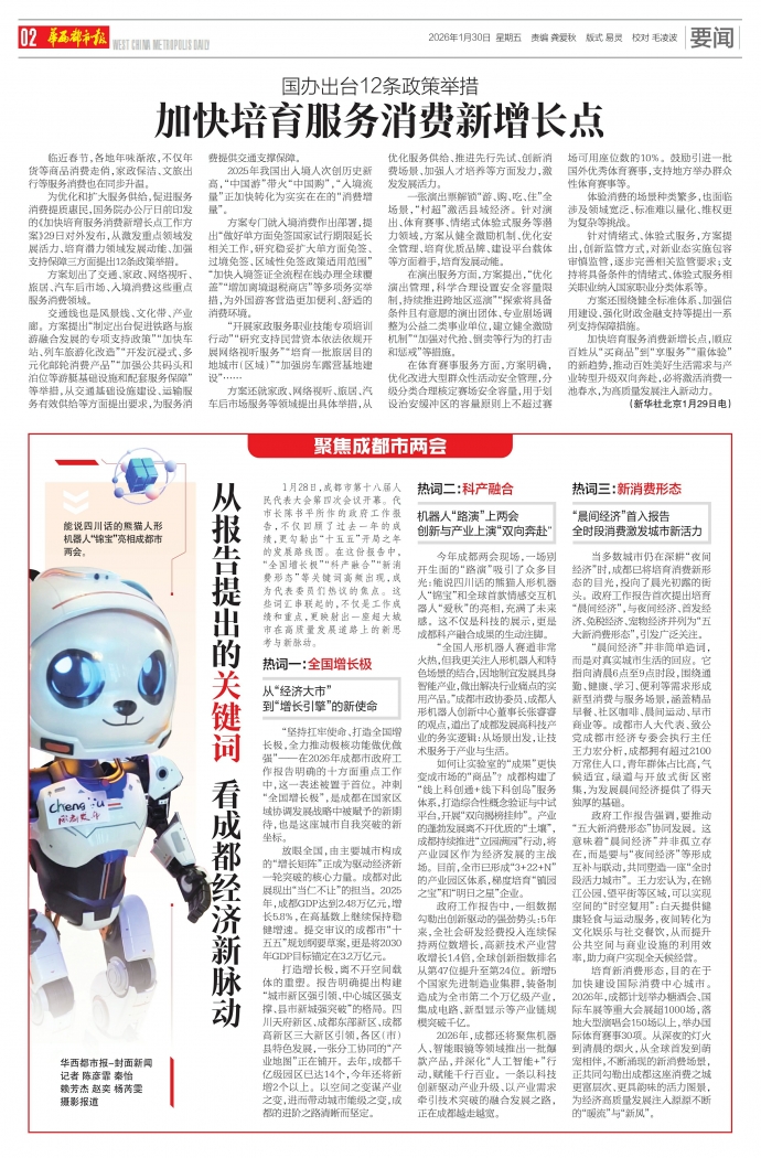为优化和扩大服务供给,促进服务消费提质惠民,国务院办公厅日前印发的《加快培育服务消费新增长点工作方案》29日对外发布,从激发重点领域发展活力、培育潜力领域发展动能、加强支持保障三方面提出12条政策举措。