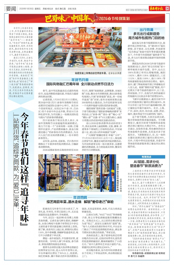 截至1月29日,记者从多家OTA、电商、物流平台获悉,“追寻年味”成为春节假期出游核心趋势,含有文艺演出、民俗和非遗、特色餐饮的综合性体验格外受青睐。美食综艺“同款”快手年菜套餐登上商超货架;在“爱你老己”“萝卜纸巾猫”等热梗的影响下,低度酒水,坚果类、肉类、巧克力类年货商品热销,有物流平台近期单量同比增长超35%。