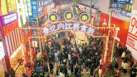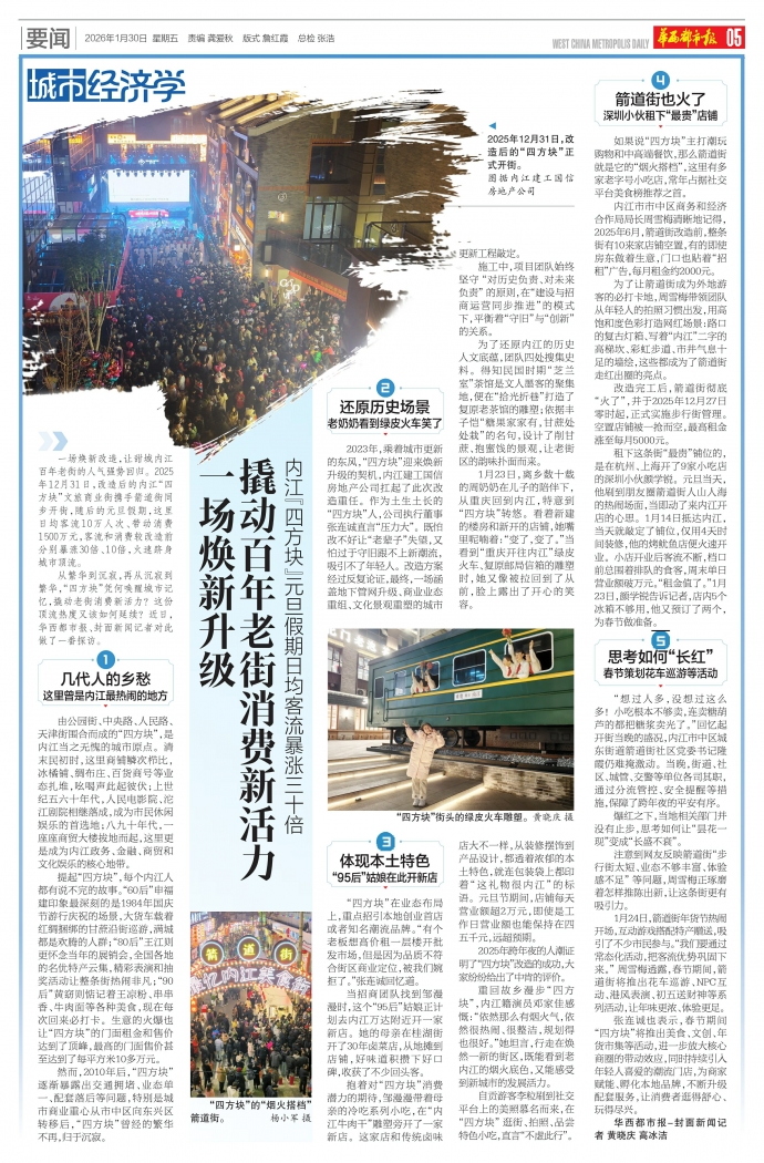 一场焕新改造,让甜城内江百年老街的人气强势回归。2025年12月31日,改造后的内江“四方块”文旅商业街携手箭道街同步开街,随后的元旦假期,这里日均客流10万人次、带动消费1500万元,客流和消费较改造前分别暴涨30倍、10倍,火速跻身城市顶流。