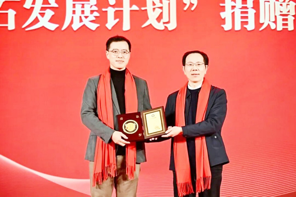 1月24日,拓竹联合创始人、COO刘怀宇(左)前往母校电子科技大学,以公司名义为“成电基石发展计划”进行首笔捐赠。 受访者供图