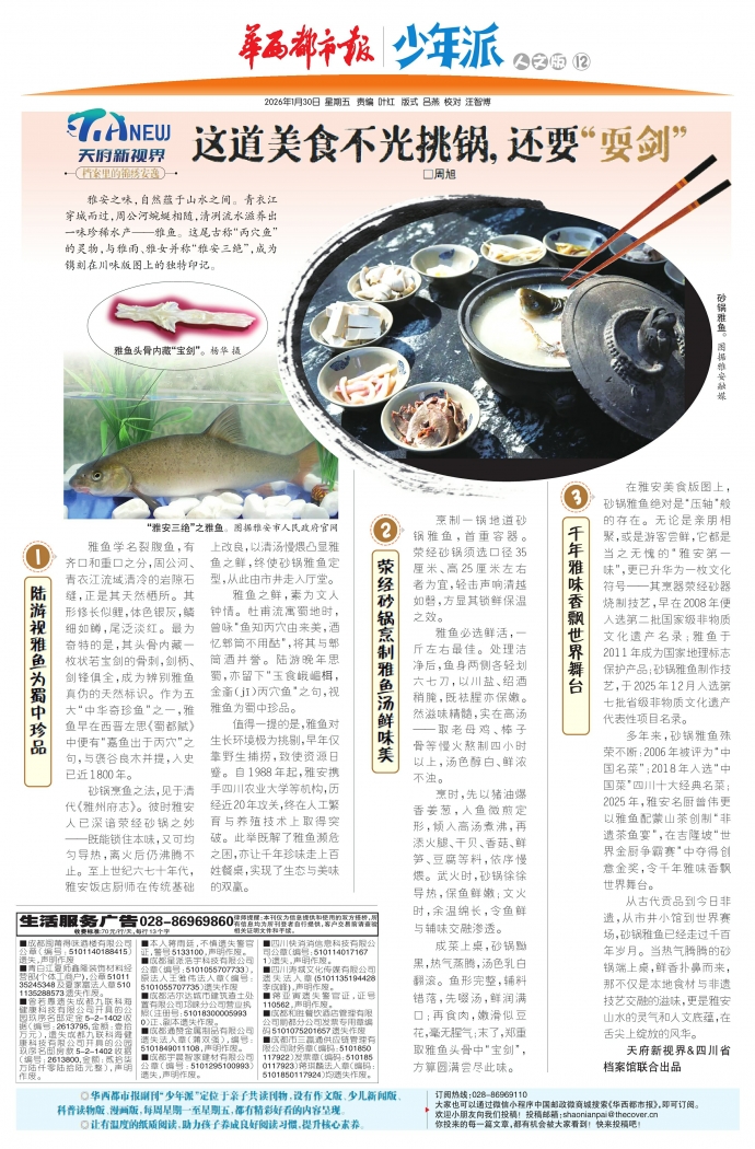 从古代贡品到今日非遗,从市井小馆到世界赛场,砂锅雅鱼已经走过千百年岁月。当热气腾腾的砂锅端上桌,鲜香扑鼻而来,那不仅是本地食材与非遗技艺交融的滋味,更是雅安山水的灵气和人文底蕴,在舌尖上绽放的风华。