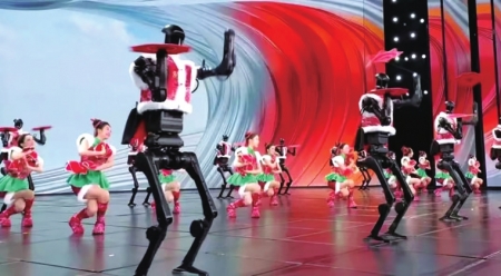 2025年央视总台春晚上,人形机器人在表演《秧BOT》。 图据宇树科技