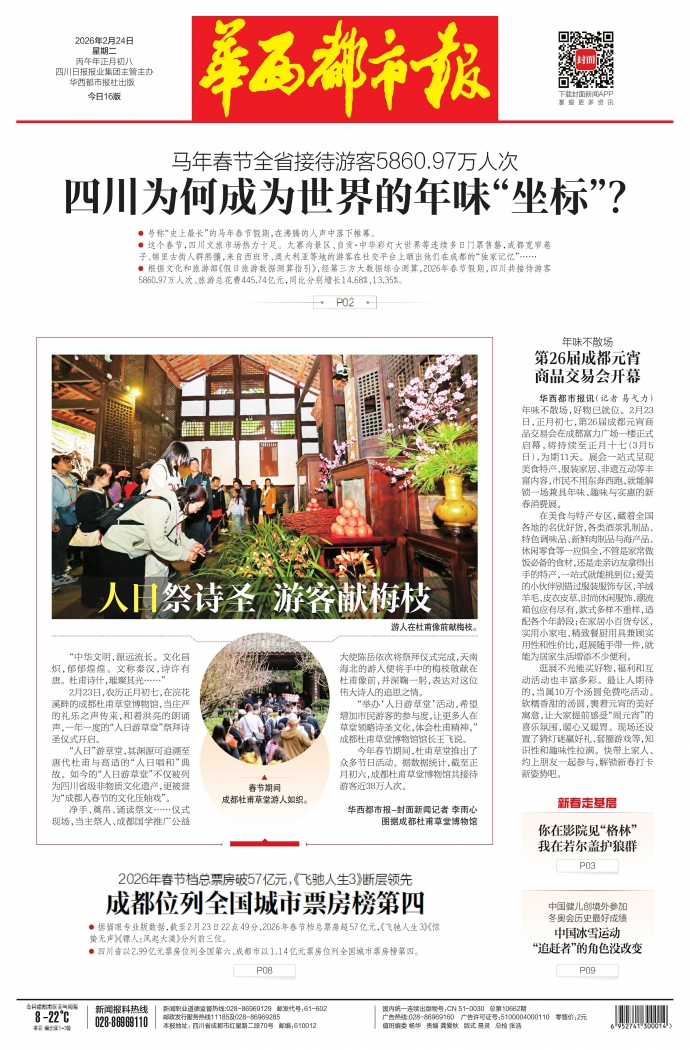 根据文化和旅游部《假日旅游数据测算指引》,经第三方大数据综合测算,2026年春节假期,四川共接待游客5860.97万人次、旅游总花费445.74亿元,同比分别增长14.68%、13.35%。
