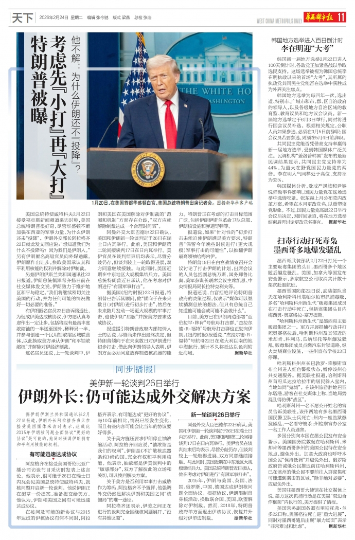 美国总统特使威特科夫2月22日接受福克斯新闻频道采访时称,美国总统特朗普很好奇,尽管华盛顿不断加强在西亚的军事力量,为什么伊朗还未“投降”。伊朗外交部长阿拉格齐22日就此发文回应说:“想知道我们为什么不投降吗?因为我们是伊朗人。”另有伊朗匿名高级官员向外媒透露,伊朗愿作出让步,换取美国承认其和平利用核能的权利并解除对伊制裁。