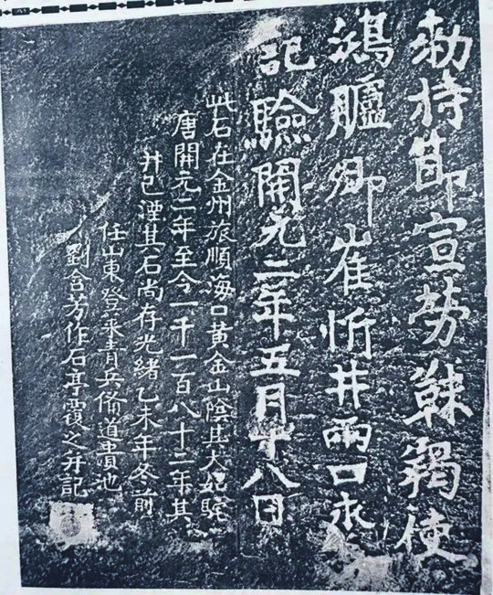 早在1911年,大连本地乡绅乔德秀在《南金乡土志》中首次记载了唐鸿胪井碑被日本非法掠夺的历史。1936年,古文字学家罗福颐在其编撰的《满洲金石志稿》中,对刻石的位置、题刻内容、题刻缘由等内容进行了较为详细的描述,并收录了题刻的拓片。