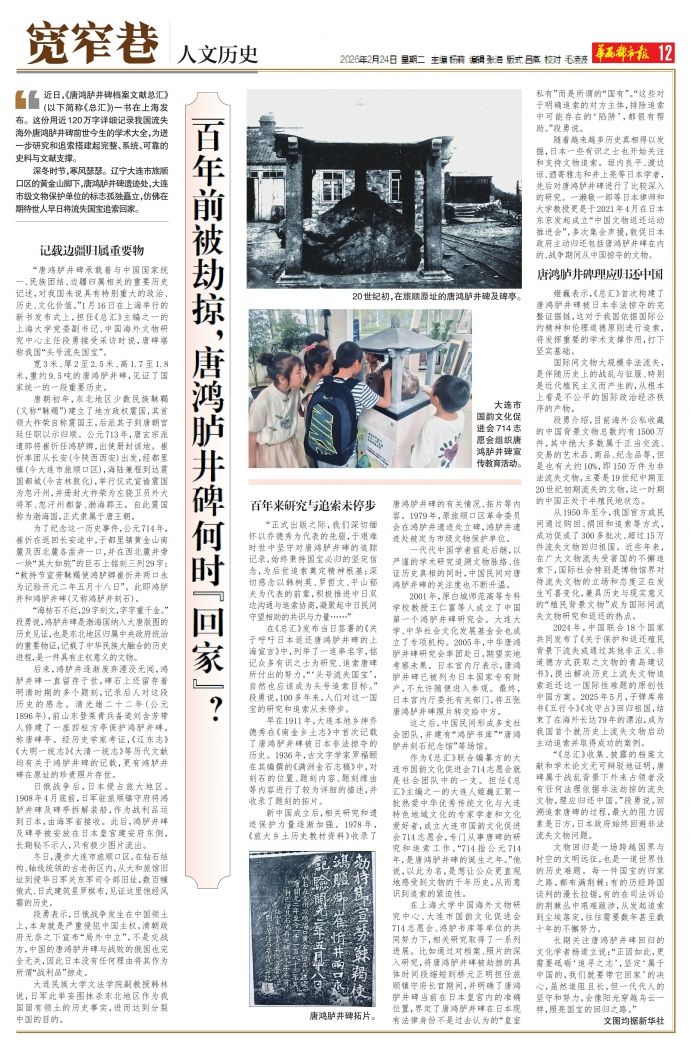 深冬时节,寒风瑟瑟。辽宁大连市旅顺口区的黄金山脚下,唐鸿胪井碑遗迹处,大连市级文物保护单位的标志孤独矗立,仿佛在期待世人早日将流失国宝追索回家。