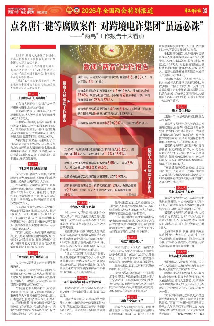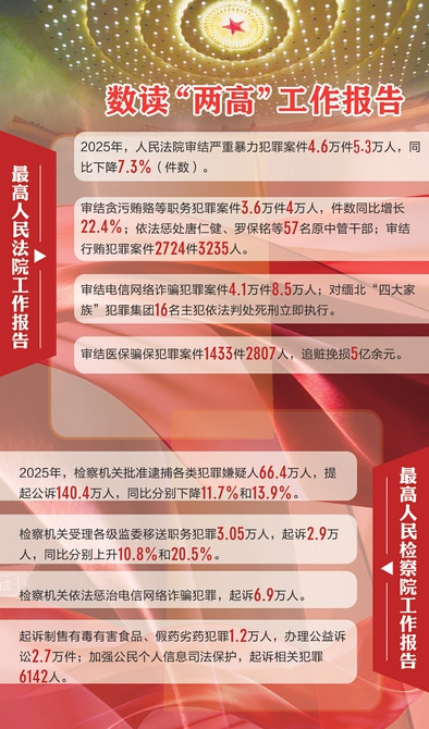 3月9日,最高人民法院工作报告、最高人民检察院工作报告提请十四届全国人大四次会议审议。