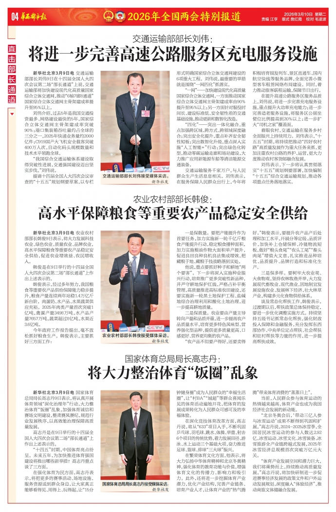 新华社北京3月9日电 农业农村部部长韩俊9日表示,将大力发展科技农业、绿色农业、质量农业、品牌农业,高水平保障粮食等重要农产品稳定安全供给,促进农业增效益、农民增收入。