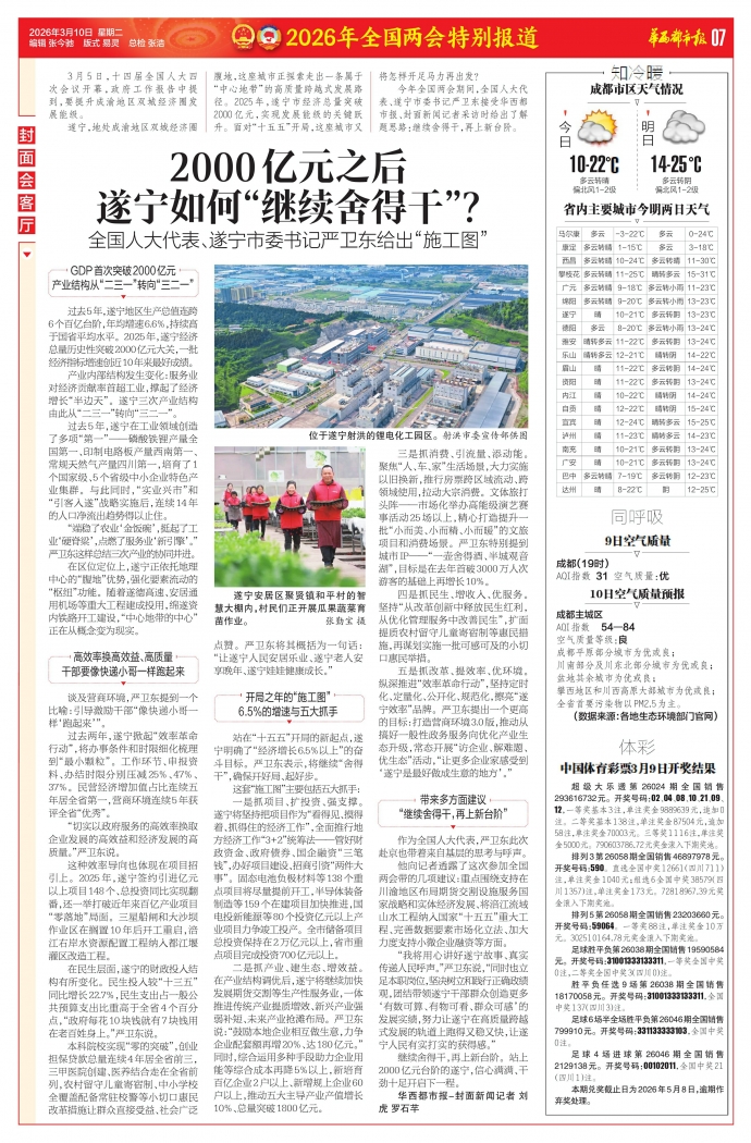 今年全国两会期间,全国人大代表、遂宁市委书记严卫东接受华西都市报、封面新闻记者采访时给出了解题思路:继续舍得干,再上新台阶。