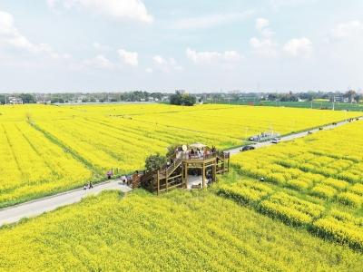 在成都东部新区养马街道,登上玻璃观景台,俯瞰壮美的“沱江第一湾”,在桃林间品尝花田火锅;在新都区军屯镇,千亩油菜花海里支起了露营帐篷,川剧变脸在花影中上演;在双流区兴海花卉产业园,3300亩“花卉王国”里不仅能赏花,还能买花、种花、品花。