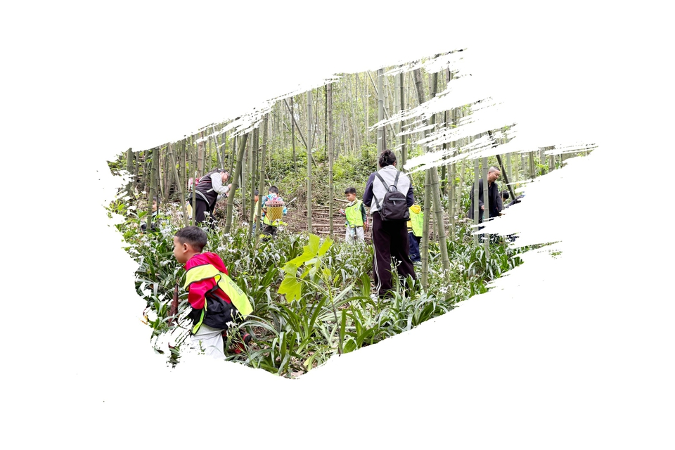 团体小游客到都江堰铜马沟竹海公园内“打笋”。 受访者供图