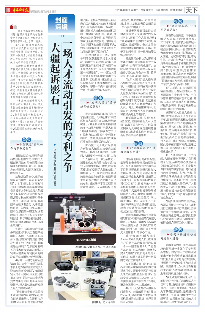 一方是全球消费级无人机市场的头部企业,另一方是占据全球全景相机市场66%份额的行业新贵。这场诉讼背后,是单纯的专利权属之争,还是市场格局巨变下的商业暗战?4月1日至3日,华西都市报、封面新闻记者多方采访,试图还原这场纠纷的来龙去脉。