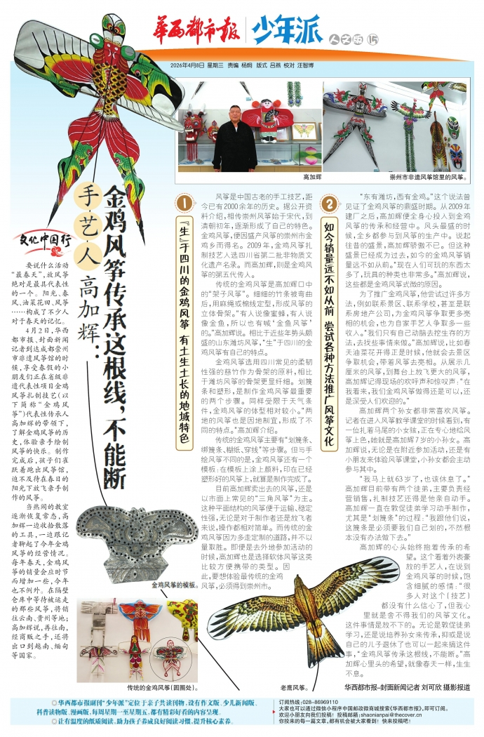 风筝是中国古老的手工技艺,距今已有2000余年的历史。据公开资料介绍,相传崇州风筝始于宋代,到清朝初年,逐渐形成了自己的特色。金鸡风筝,便因盛产风筝的崇州市金鸡乡而得名。2009年,金鸡风筝扎制技艺入选四川省第二批非物质文化遗产名录。而高加辉,则是金鸡风筝的第五代传人。