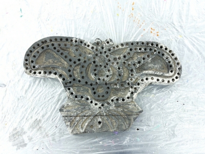 传统的金鸡风筝主要有“划篾条、绑篾条、糊纸、穿线”等步骤。但与手绘风筝不同的是,金鸡风筝还有一个模板:在模板上涂上颜料,印在已经塑形好的风筝上,就算是制作完成了。