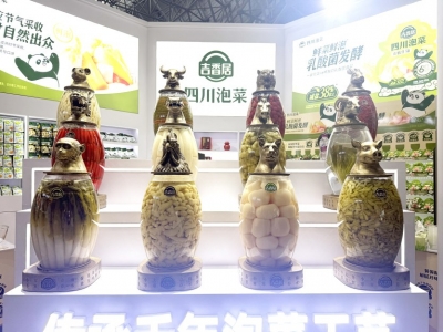 吉香居食品股份有限公司展柜前的十二生肖泡菜坛,让路过的游客纷纷驻足、拍照、品尝。“吉香居的榨菜我从小就在吃,家乡的老味道了。”眉山市民陈洪林说,他在眉山经营一家调味品店,自从去年参加过泡博会后,便对这一泡菜界的盛会念念不忘。今年参加泡博会,也是想找一个对接厂商的机会。