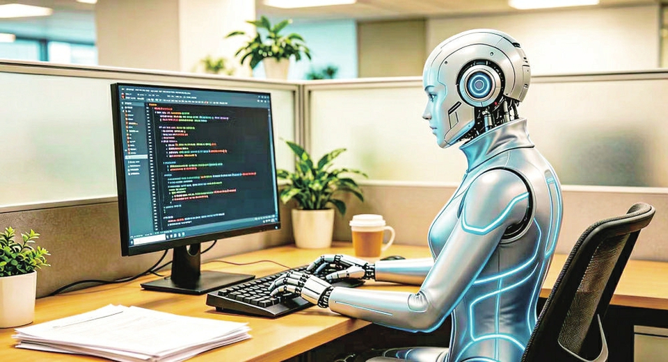 人工智能机器人正在电脑前工作(AI生成图片)。图据新华每日电讯