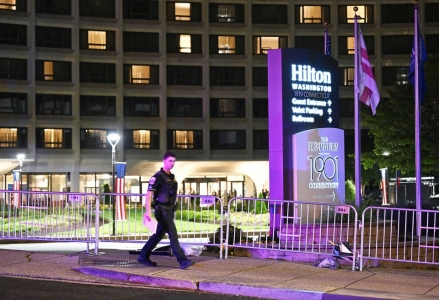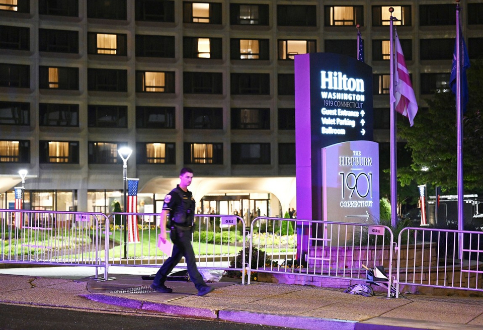 4月25日,一名警察走在举行白宫记者协会晚宴的美国华盛顿希尔顿酒店附近。新华社记者李睿摄