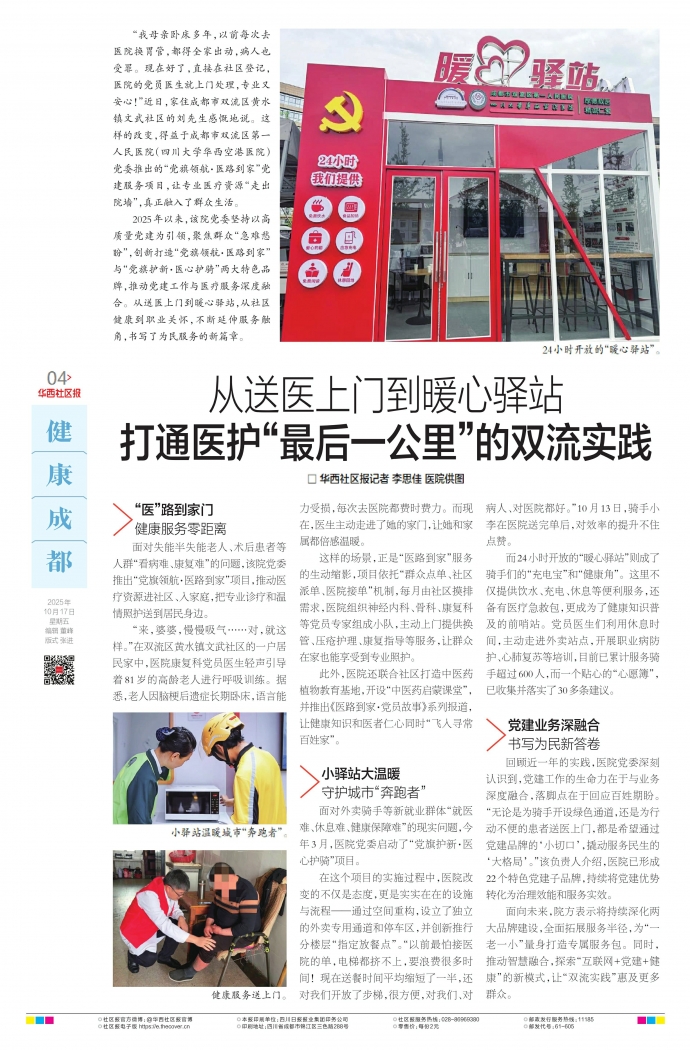“我母亲卧床多年,以前每次去医院换胃管,都得全家出动,病人也受罪。现在好了,直接在社区登记,医院的党员医生就上门处理,专业又安心!”近日,家住成都市双流区黄水镇文武社区的刘先生感慨地说。这样的改变,得益于成都市双流区第一人民医院(四川大学华西空港医院)党委推出的“党旗领航·医路到家”党建服务项目,让专业医疗资源“走出院墙”,真正融入了群众生活。