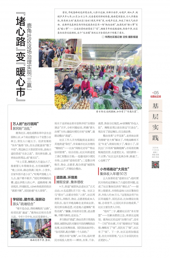 曾经,早晚高峰的龙祥商业街,人挤不过摊、车挪不动步,吆喝声、喇叭声、剐蹭声声声入耳;10月24日上午,记者看到同样的街巷,路面宽阔整洁,行人步履轻快,街角新立的“鹿角社区(临时)便民市场”里,吆喝声还在,却成了烟火气的序曲。成都市龙泉驿区西河街道鹿角社区用一场“靶向治理”,把居民的“堵心事”变成“暖心事”——占道经营的游商进了“家”,拥堵多年的道路通畅,街面干净,社区集体经济还能增收,这个“生活圈”里的五万余居民终于舒展了眉头。