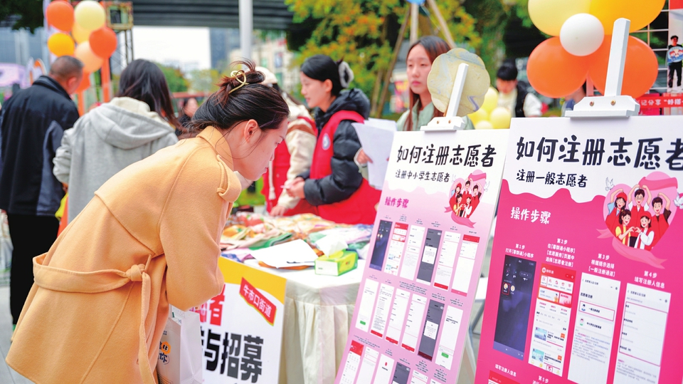 居民在志愿者招募台前驻足。