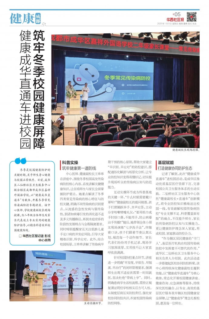 记者了解到,此次“健康成华直通车”进校园活动,是成华区推动优质基层医疗资源下沉、完善校园公共卫生服务体系的生动实践。二仙桥社区卫生服务中心依托“健康副校长+直通车”创新模式,将专业防控知识精准送达校园一线,有效破解校园传染病防控“专业支撑不足、科普覆盖面有限”的痛点,不仅提升师生、家长的传染病防控认知与实操能力,更让健康防护理念深入家庭,形成校园、家庭联动防控合力。