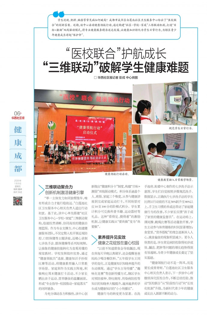学生近视、肥胖、龋齿等常见病如何破局?成都市成华区白莲池社区卫生服务中心给出了“医校联合”的创新答案。近期,该中心启动健康领航行动,通过构建“社区-学校-家庭”三维联动机制,打造“目标+激励”双线驱动模式,将专业健康服务精准送达校园,让健康知识转化为学生日常行为,为辖区青少年健康成长撑起“保护伞”。