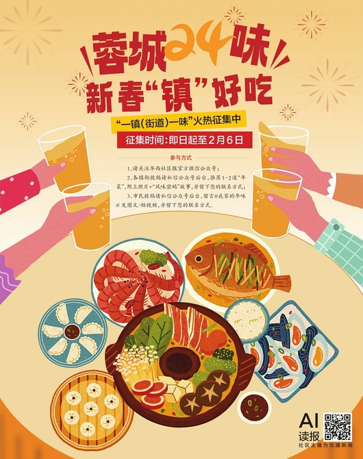 “一镇(街道)一味”火热征集中征集时间:即日起至2月6日参与方式 1、请关注华西社区报官方微信公众号;2、各镇街投稿请私信公众号后台,推荐1-2道“年菜”,附上照片+“风味密码”故事,并留下您的联系方式; 3、市民投稿请私信公众号后台,留言#我家的年味#发图文/短视频,并留下您的联系方式。