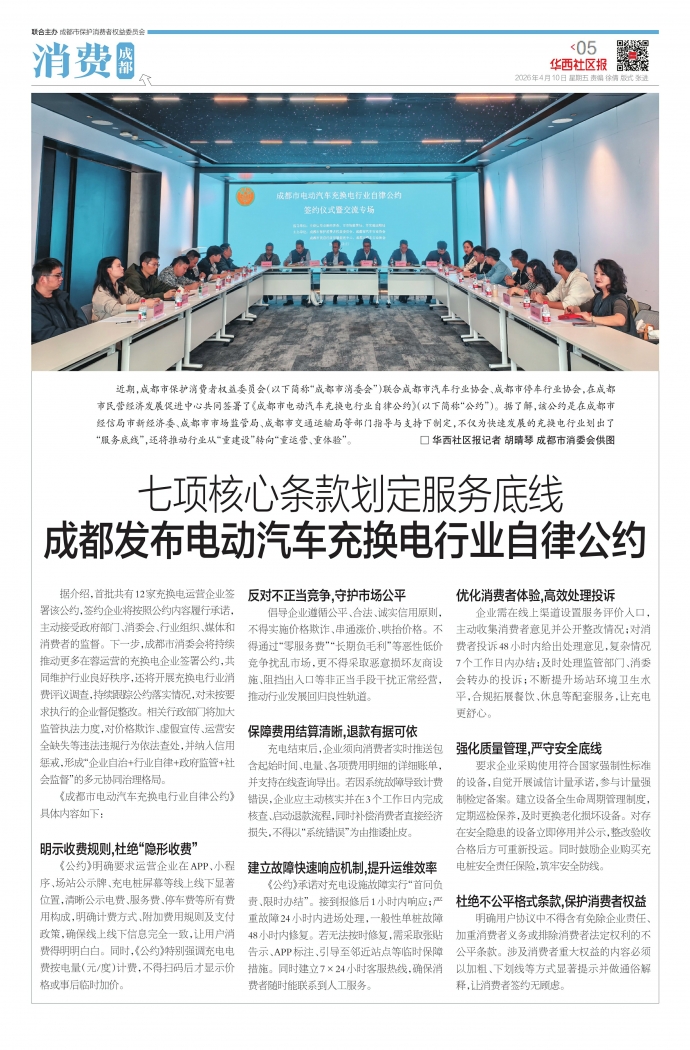 据介绍,首批共有12家充换电运营企业签署该公约,签约企业将按照公约内容履行承诺,主动接受政府部门、消委会、行业组织、媒体和消费者的监督。下一步,成都市消委会将持续推动更多在蓉运营的充换电企业签署公约,共同维护行业良好秩序,还将开展充换电行业消费评议调查,持续跟踪公约落实情况,对未按要求执行的企业督促整改。相关行政部门将加大监管执法力度,对价格欺诈、虚假宣传、运营安全缺失等违法违规行为依法查处,并纳入信用惩戒,形成“企业自治+行业自律+政府监管+社会监督”的多元协同治理格局。