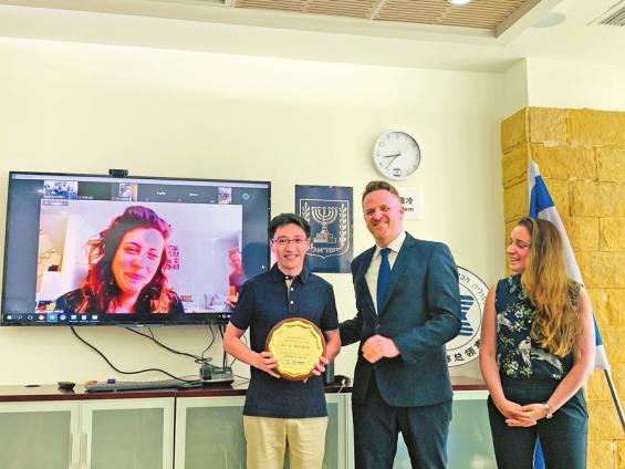 ▲5月11日,以色列驻成都总领事馆内,蒋伟与玛阿雅视频连线,并获得一枚以色列奖章。