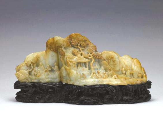 除了上述实物器物,还有一些装饰性器物,如兰亭玉册、兰亭如意、玉山子、插屏、漆宝盒等。这些器物,大多是螺蛳壳里做道场,于细微中见精深。比如那件青玉兰亭修禊山子(即玉石雕刻),雕刻的人物众多,形态各异,最宽处却只有31.5厘米;而那件雕刻了《兰亭序》全文的乾隆款碧玉兰亭记双面插屏,也只有18厘米。它们不是以宏大来征服人,而是以小来震撼人。