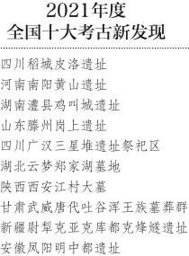 全国十大考古新发现由国家文物局指导,中国文物报社和中国考古学会主办,迄今已举办了30余届。本届评选,主办方从全国报名项目中遴选了32个项目参加初评,其中20个项目进入终评。最终,四川稻城皮洛遗址、河南南阳黄山遗址、湖南澧县鸡叫城遗址、山东滕州岗上遗址、四川广汉三星堆遗址祭祀区、湖北云梦郑家湖墓地、陕西西安江村大墓、甘肃武威唐代吐谷浑王族墓葬群、新疆尉犁克亚克库都克烽燧遗址、安徽凤阳明中都遗址入选。