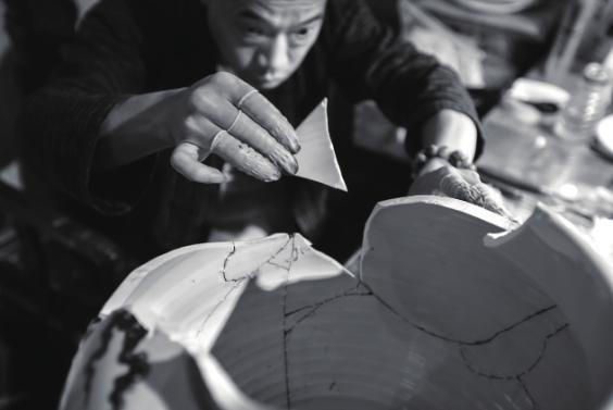 陈刚将碎成90多片的元代孔雀绿釉龙纹大罐修复成功。