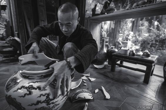 同年,陈刚收到了修复元代孔雀绿釉龙纹大罐的任务。10年前,同等大小的明代青花大罐“鬼谷下山”在佳士得拍出了2.3亿人民币的高价。看着90多片碎瓷,他想到如果能将它修复好,这官窑的龙纹大罐依然能重新焕发光彩、依然能有很高的价值心里就很激动!经过多日的研究,陈刚准备接受挑战。塑型、补缺、固胎、反复打磨、一遍遍上漆……11个月后,终于修复成功。目前,修好的元代孔雀绿釉龙纹大罐正作为重要展品在浓园艺术博览园主办的文博艺术体验展进行展出。