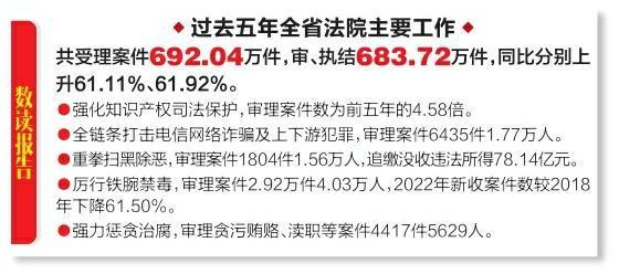 报告指出,五年来,全省法院坚持除骗务尽,全链条打击电信网络诈骗及上下游犯罪,审理案件6435件1.77万人。重拳扫黑除恶,审理案件1804件1.56万人,追缴没收违法所得78.14亿元。厉行铁腕禁毒,审理案件2.92万件4.03万人,2022年新收案件数较2018年下降61.50%。强力惩贪治腐,审理贪污贿赂、渎职等案件4417件5629人。