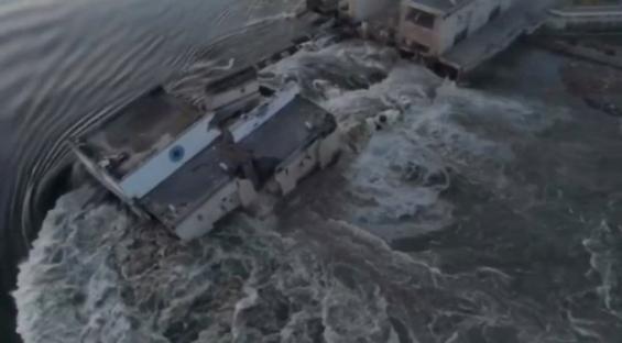 6月6日在乌克兰赫尔松州拍摄的被炸毁的卡霍夫卡水电站大坝(视频截图)。 新华社发
