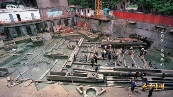 片中,还引用到古籍记载来加大对古蜀文明相关文物的考据。据《华阳国志·蜀志》记载:“开明王自梦郭移,乃徙治成都。”开明王或由于某个重要事件,或为了部族的生存和发展,决定将都城迁往成都。迁都后随即效仿中原礼制,在古蜀建立起宗庙礼乐制度。据文献记载,开明氏一族习水,长期与水和船相伴,逝后极有可能以船棺入葬,或留下商业街二次葬的奢华墓地。但由于缺乏文字记载,墓主身份尚无法推断。