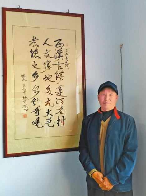 王和平,山东省德州市武城县四女寺村人。今年4月27日在当地镇文化馆接受华西都市报、封面新闻记者采访时,他身后的一幅书法作品格外打眼,细看落款,正是他本人。王和平中气十足地念道:“西汉古镇,运河名村,人文胜地,多元大邑,孝德之乡,水利奇观。这是我总结出来的四女寺表述语。”