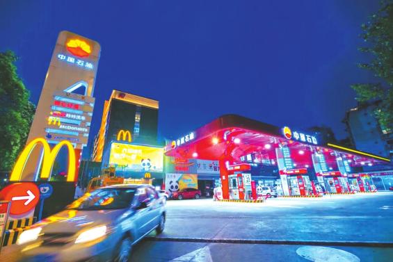 夜幕下的成都市金牛区芙蓉加油站亮起大运会元素展示牌。金婷婷摄