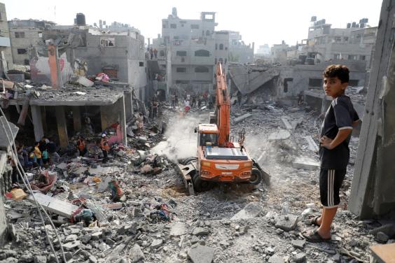 10月25日,在加沙地带南部城市汗尤尼斯,挖掘机在以色列空袭后的建筑废墟现场作业。 新华社发