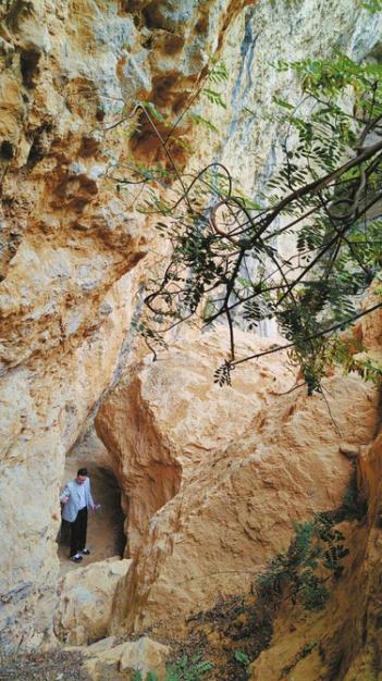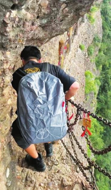 栈道最多两米宽,左侧是潮湿的崖壁,右侧是万丈深渊,还要不时猫腰前行,以免与头顶嶙峋的岩石撞个正着。颇具特色的龙骨石岩壁上面,凸起的小尖锥也需要十分提防。