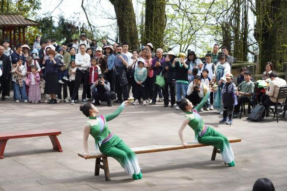 清明假期,蒙顶山景区的龙行十八式茶技表演吸引游客观看。图据雅安市文化体育和旅游局