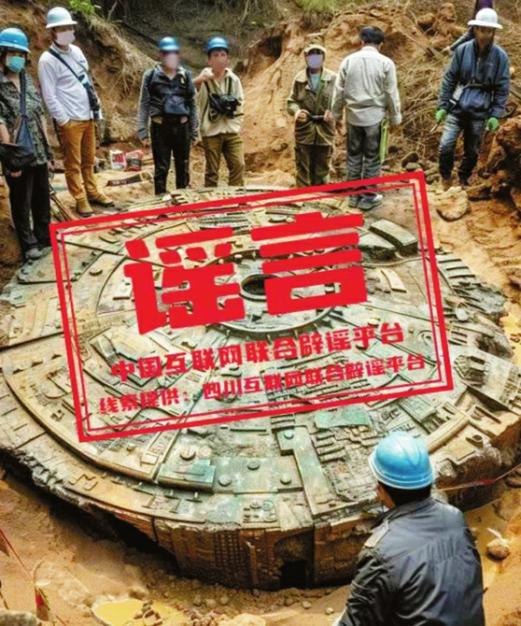 帖文配图是一个考古挖掘现场,画面中间有一个飞碟型的青铜器物,上面有许多纹路、部件,看起来科技感十足,周围站着几名戴着头盔的人员。图片再度提及“三星堆文明外星起源说”,但更多网友跟帖提醒,这只是AI生成的网络梗图一张。