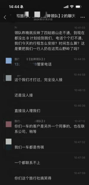 然而,7月21日,一行人刚从马尔康出发不到一小时,司机就接到电话,再次确认四姑娘山封路。“这个时候,司机让我们自己联系旅行社,看接下来怎么办。”胡女士说,他们各自联系了对接的客服、旅行管家,“要么不接电话,要么就是不回复备选方案。直到一个小时后,才给出一个回复,喊我们自己商量安排。”