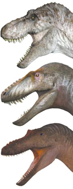 霸王龙(上)、亚洲暴龙(中)和虔州龙(下)等三种暴龙的头部复原图。前两者是深吻型,虔州龙是长吻型。
