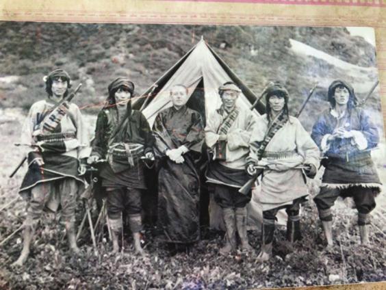 杜基从卧室柜子里翻出一本影集,一张边角已磨破的黑白照躺在夹层里。照片中间,站着身着藏服的洛克,身旁是五名藏族青年。杜基说,洛克左边背着火枪的男子,就是他的爷爷苏拉翁几。