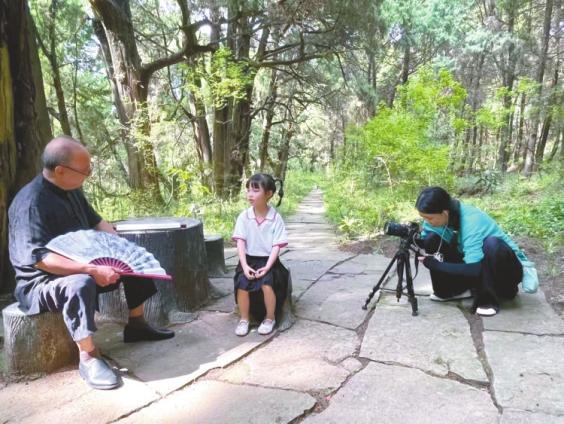 华西都市报、封面新闻记者李佳雨(右)在广元翠云廊进行实拍。