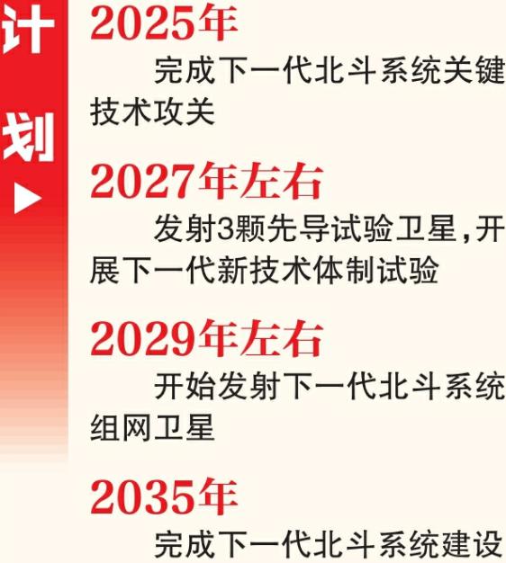“计划2025年完成下一代北斗系统关键技术攻关;2027年左右发射3颗先导试验卫星,开展下一代新技术体制试验;2029年左右开始发射下一代北斗系统组网卫星;2035年完成下一代北斗系统建设。”杨长风表示。