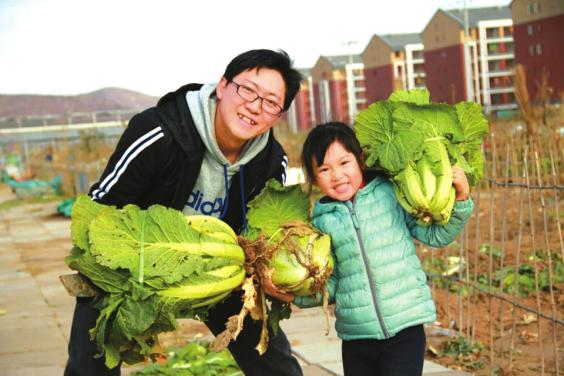 王元卓与孩子一起收获栽种的大白菜。